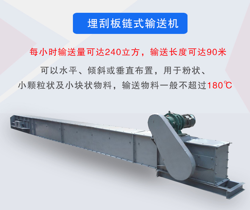 埋刮板輸送機(jī)即埋刮板輸送機(jī),它是借助刮板鏈條在封閉的矩形斷面的殼體內(nèi)連續(xù)輸送散狀物料的運(yùn)輸設(shè)備,在輸送物料的過(guò)程中刮板鏈條埋于被輸送的物料之中,故而稱“埋刮板輸送機(jī)” ,可以水平、傾斜或垂直布置,用于粉狀、小顆粒狀及小塊狀物料,輸送物料一般不超過(guò)180℃。