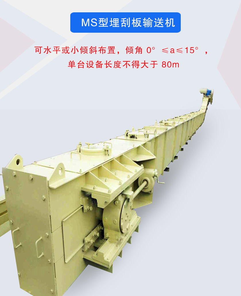 2、MS型埋刮板輸送機(jī):可水平或小傾斜布置,傾角 0°≤a≤15°,單臺(tái)設(shè)備長(zhǎng)度不得大于 80m。