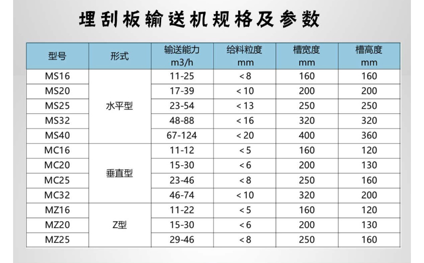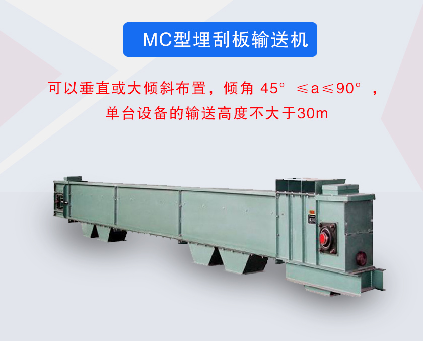 3、MC型埋刮板輸送機(jī):可以垂直或大傾斜布置,傾角 45°≤a≤90°,單臺(tái)設(shè)備的輸送高度不大于30m。