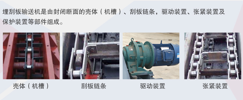 埋刮板輸送機(jī)是由封閉斷面的殼體(機(jī)槽)、刮板鏈條,驅(qū)動(dòng)裝置、張緊裝置及保護(hù)裝置等部件組成。