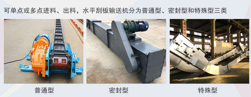 水平刮板輸送機是指水平方向上輸送粉狀及顆粒狀物料的設備,可單點或多點進料,出料,水平刮板輸送機分為普通型、密封型和特殊型三類,采用密封式設計,可防止粉塵污染.