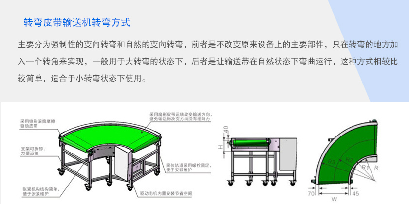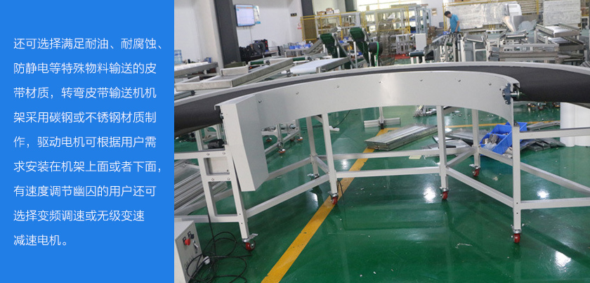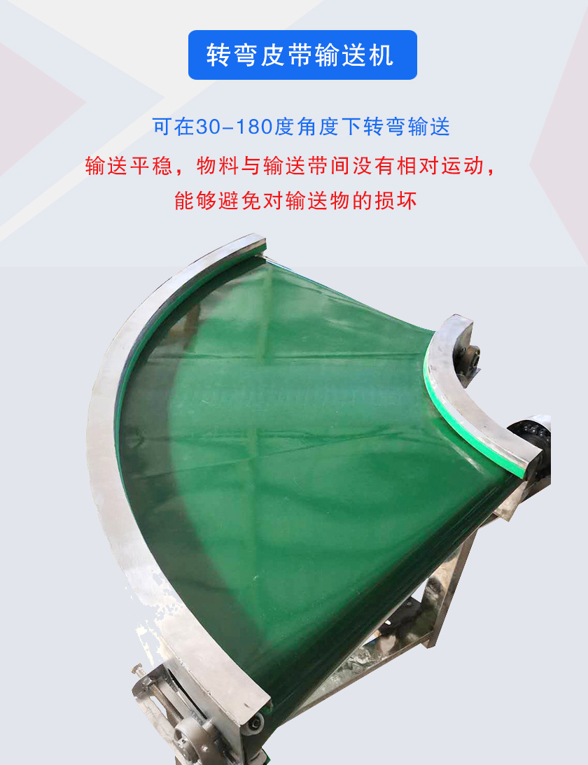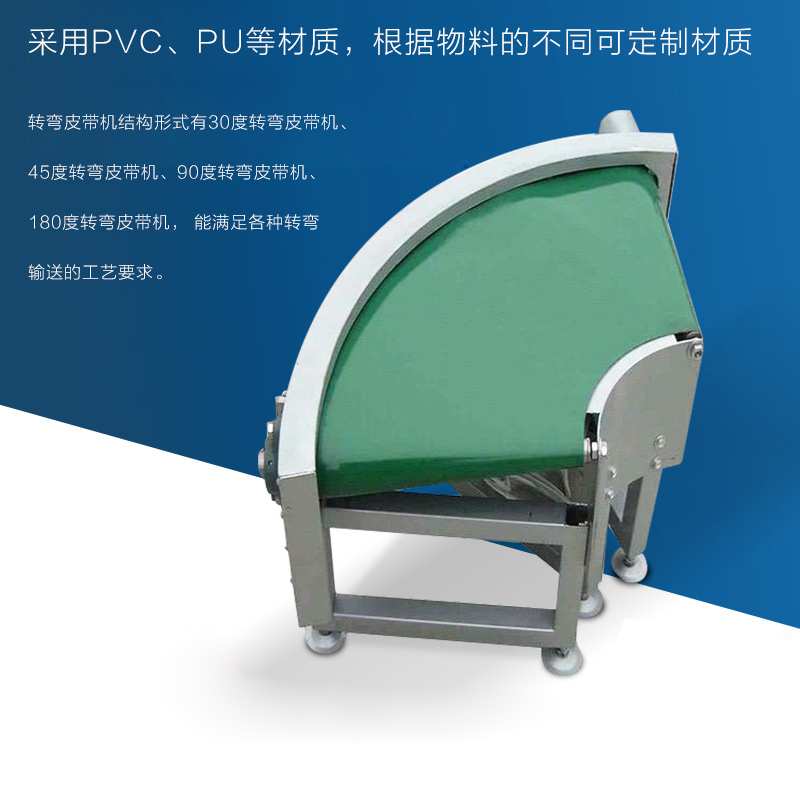 轉彎皮帶輸送機簡稱轉彎皮帶機可30°,45°,90°和180°輸送物料,轉彎皮帶輸送機輸送帶可根據(jù)輸送物料的性質選擇PVC、PU材質,除輸送普通物料外,還可選擇滿足耐油、耐腐蝕、防靜電等特殊物料輸送的皮帶材質.