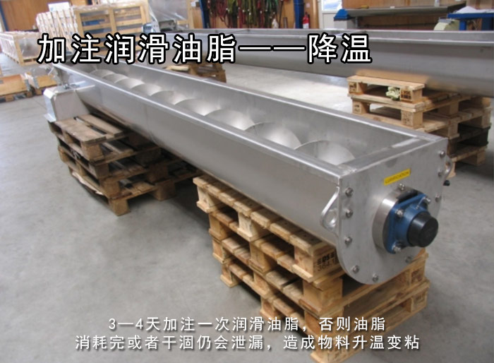 有些物料在溫度達(dá)到一定程度時會改變性質(zhì)變得有粘性,這是因為物料與螺旋葉片和螺旋管壁的摩擦?xí)a(chǎn)生一定的溫升,螺旋傳動軸頭也會在工作過程中產(chǎn)生一定溫度,如果因為升溫而變的有粘性,勢必會造成螺旋輸送機(jī)不能正常工作,所以要有正確的處理方法就是一般主要依靠加注油潤滑而對螺旋輸送機(jī)的內(nèi)部進(jìn)行降溫。