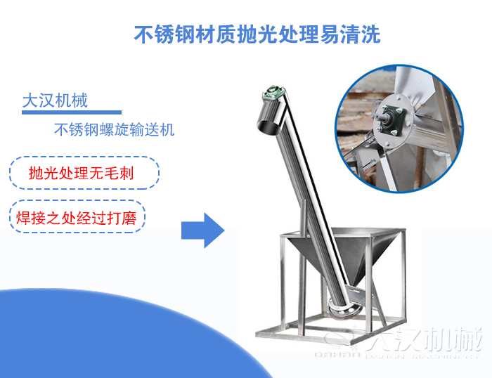 在食品行業的對于機械設備的選用有著嚴格的衛生要求,大漢生產的不銹鋼螺旋輸送機整機經過嚴格的拋光處理無毛刺,焊接之處也經過打磨而成,這樣就能夠保證物料不會因為殘留物,而出現腐壞的現象,在清理方面也是非常的容易,所以不銹鋼螺旋輸送機相比普通碳鋼材質的螺旋輸送機更耐用。