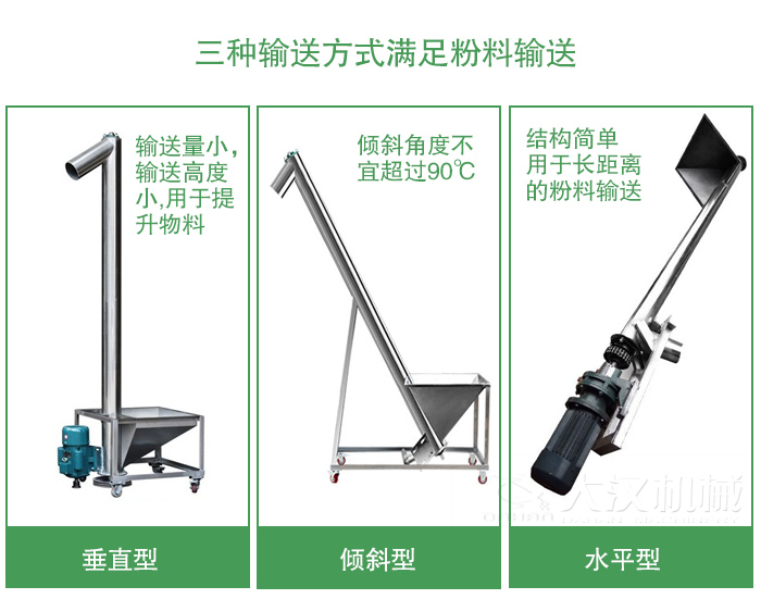 垂直型管式螺旋輸送機——輸送量小,輸送高度小,轉(zhuǎn)速較高,能耗大。特別適宜輸送流動性好的粉粒狀物料,主要用于提升物料,提升高度一般不大于8米。