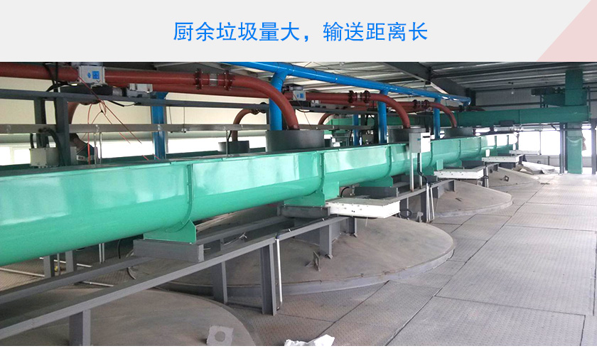 對于廚余垃圾輸送,一般量比較大,無軸螺旋輸送機扭矩可達4000N/m,輸送長度可達60m,輸送量是相同直徑傳統(tǒng)有軸螺旋輸送機的1.5倍,輸送量大,能滿足廚余垃圾的輸送需求。