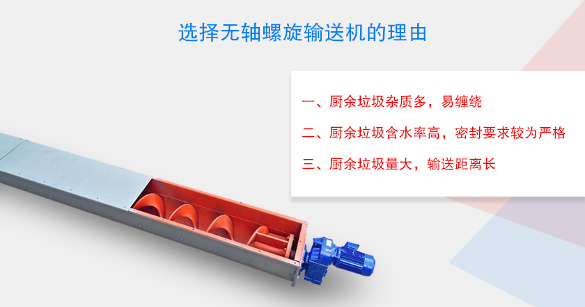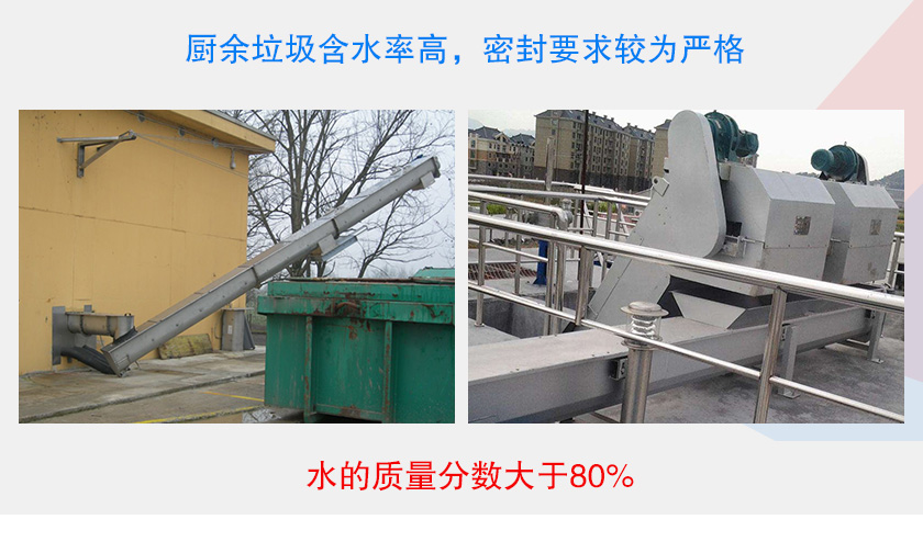 廚余垃圾含水率高,(水的質(zhì)量分數(shù)大于80%),不便收集運輸,熱值低,處理不當容易產(chǎn)生滲瀝液等二次污染物,所以要求螺旋輸送機密封條件要好,無軸螺旋輸送機采用全封閉輸送和易清洗的螺旋表面,可保證環(huán)境衛(wèi)生和所送物料不受污染、不泄漏。