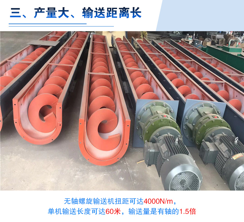 對(duì)于污泥輸送來說,用戶也比較關(guān)系設(shè)備的輸送效率,無軸螺旋輸送機(jī)扭距可達(dá)4000N/m,單機(jī)輸送長度可達(dá)60米,輸送量是有軸的1.5倍,另外還可根據(jù)用戶需要,采用多級(jí)串聯(lián)式安裝,對(duì)污泥進(jìn)行超長距離的輸送。
